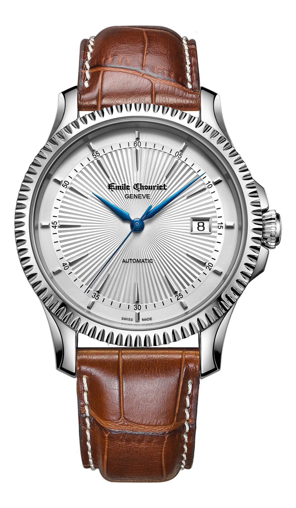 EMILE CHOURIET Automatic: A 40mm stainless steel case in muted grey frames a crisp white...