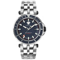 Sporty men's Versace watch, Swiss-made and powered by a reliable Swiss quartz movement, features a 46 mm stainless-steel case, blue dial with date display, and scratch-resistant sapphire crystal; 20 ATM water resistance makes it safe for swimming. The stainless-steel link bracelet includes a central safety butterfly clasp and removable links (we include a free tool for sizing). Packaged in the original Versace box with authenticity card and verification code.