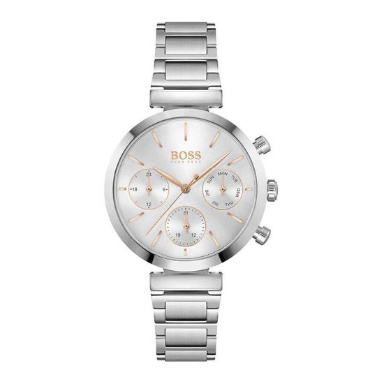 This Hugo Boss watch is made of steel and has a case width of 36 mm (measured without the crown). It has mineral glass and is powered by a quartz movement. The watch strap is made of stainless steel. The watch has a day and date indication.