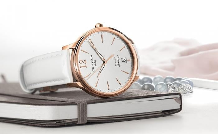 The Certina DS Dream (ref. C021.810.36.037.00) is an elegant 38 mm Swiss ladies' watch combining a rose-gold PVD stainless-steel case, silver dial with rose-gold indices and date at 6, scratch-resistant sapphire crystal, and a white leather strap with matching folding clasp. Powered by high-precision Precidrive™ quartz (Cal. F07.411), it delivers chronometer-level accuracy and 100 m water resistance—refined, reliable and ideal for everyday wear.
