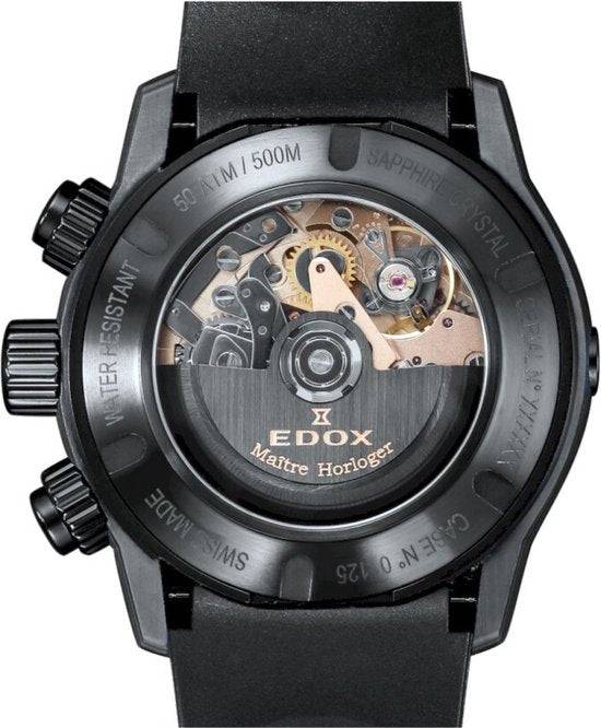 EDOX CO-1 CARBON 01125 CLNGN BUNN — a 45 mm carbon-fibre men’s diving chronograph that pairs lightweight strength with professional 50 ATM (500 m) water resistance; powered by Swiss quartz EDOX Caliber 011 (Sellita SW500), it sports a black dial with luminous hands, sapphire crystal, rotating bezel, screw‑down crown and a durable black rubber strap — engineered for serious diving and refined everyday wear.