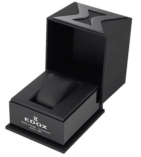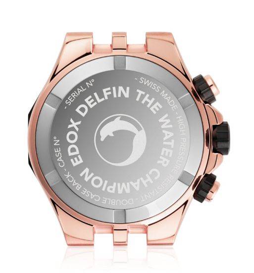The Edox Delfin Chronograph 10110 357RNCA NIR is a Swiss-made, sporty 43 mm timepiece that pairs a rose-gold PVD stainless steel case and black 24 mm rubber strap with a black dial, rose-gold hands and indices, and a date at 6 o’clock; powered by a precise quartz chronograph movement, it features scratch-resistant sapphire, a screw-down crown and case back, 12.2 mm case thickness and 200 m water resistance—continuing the Delfin legacy as Edox’s “water champion” since 1961.