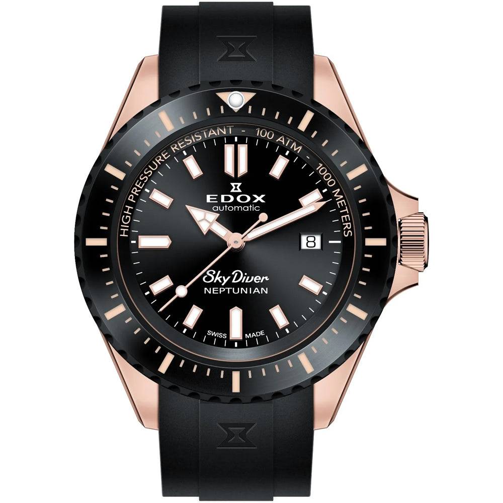 Edox Skydiver Neptunian 44mm — a rugged yet refined professional diver’s watch in stainless steel with a black dial, ceramic unidirectional bezel, sapphire crystal with anti‑reflective coating, automatic Edox calibre 80 (Sellita SW200), Super‑LumiNova hands and indices, helium escape valve and 1000 m (100 ATM) water resistance, on a durable silicone strap — engineered for saturation diving and sophisticated everyday wear.