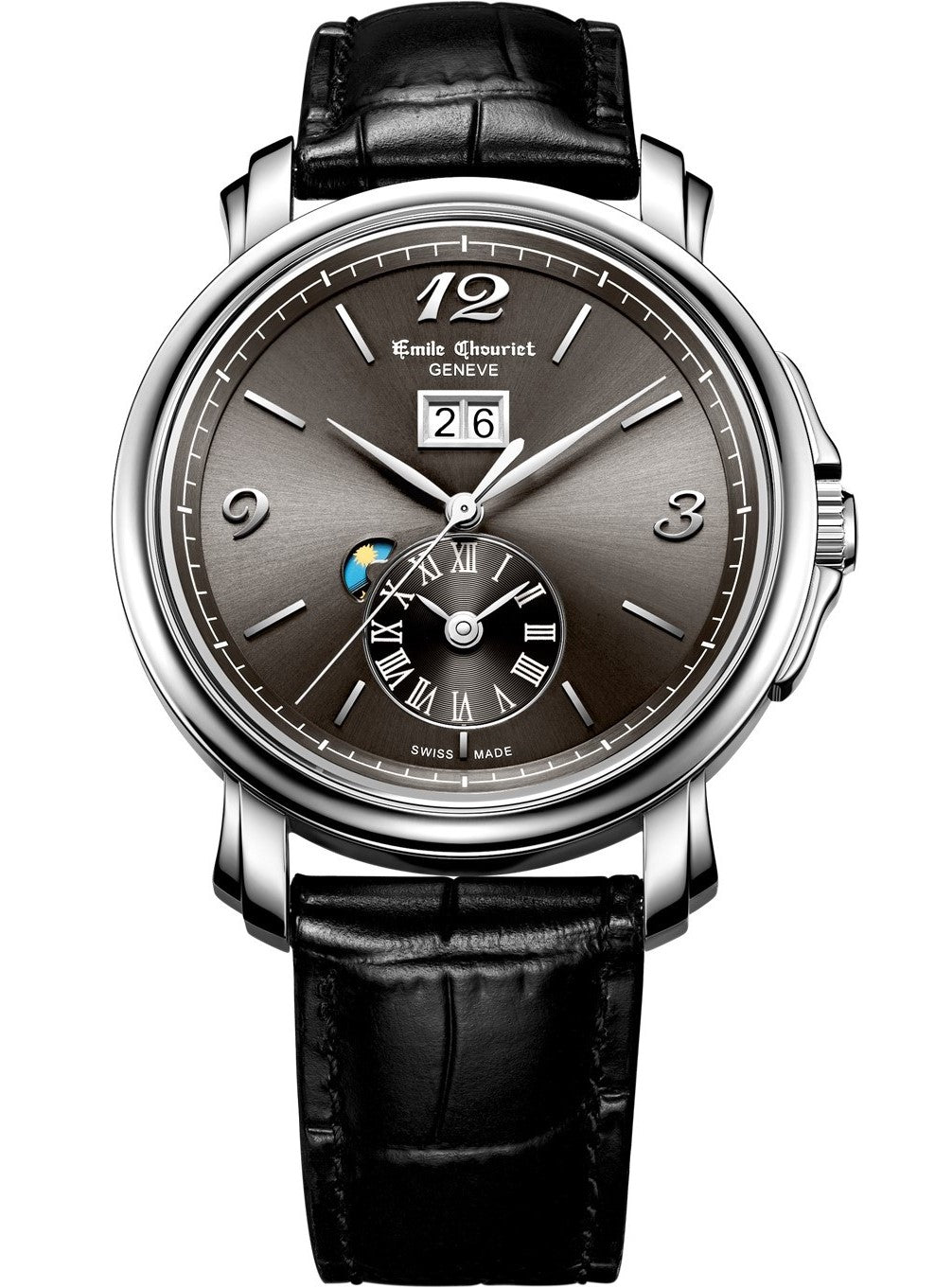 The EMILE CHOURIET Automatic marries Swiss mechanical precision with understated elegance: a subtly grey stainless steel 39mm case frames a pristine white dial under scratch‑resistant sapphire crystal, paired with a premium black leather strap and classic buckle. Powered by a refined automatic movement and rated 3 ATM, it delivers reliable everyday durability while maintaining the refined proportions and monochrome versatility that suit both the boardroom and black‑tie occasions.
