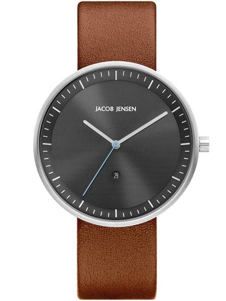 The Jacob Jensen 275 Strata men's watch marries sleek Danish minimalism with Swiss precision: a 41 mm stainless steel case (8 mm slim) frames an anthracite-grey dial with silver indices and date window, protected by mineral glass and paired with a cognac leather strap; powered by a Swiss Ronda quartz movement and water-resistant to 3 ATM (splash resistant), the Strata collection’s clean lines make it equally suited to formal and casual occasions—see the specifications tab for full details.