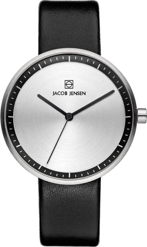 The Jacob Jensen 280 from the Strata collection is a refined ladies' watch that blends Scandinavian minimalism with premium details: a 36 mm stainless steel case, silver dial with subtle black accents beneath mineral crystal, reliable quartz movement, a comfortable black leather strap, and 3 ATM water resistance for everyday wear.