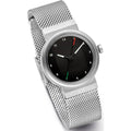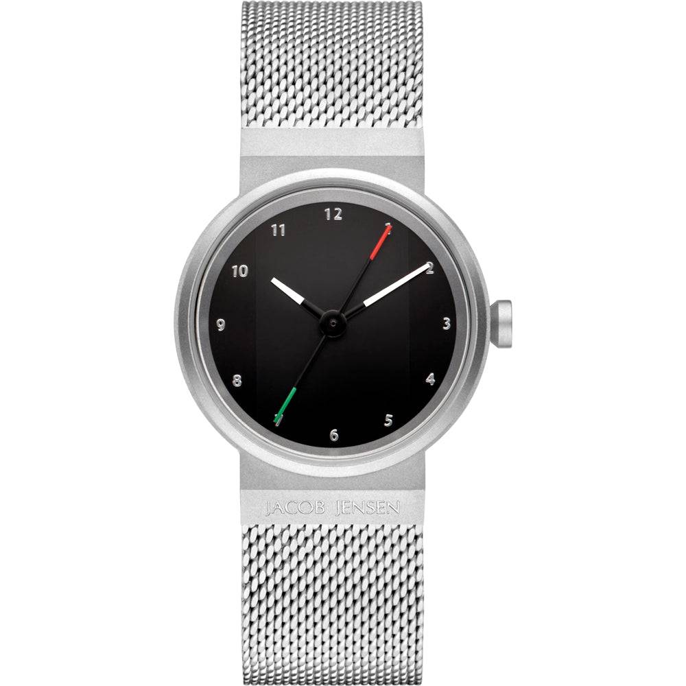 The Jacob Jensen New Line JJ790 blends minimalist Scandinavian design with refined detailing — a 29 mm matte stainless-steel case, black dial with Arabic numerals under mineral glass, and a 17 mm silver stainless-steel mesh strap with push-button clasp. Water-resistant to 3 ATM and powered by a reliable quartz movement, this women's watch offers understated elegance for everyday wear and special occasions.