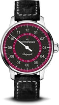 The Meistersinger Perigraph pairs minimalist single‑hand, 12‑hour timekeeping with a distinctive peripheral open date ring; housed in a 43 mm stainless steel case, it features a black dial with green accents, Swiss automatic movement, scratch‑resistant sapphire crystal, and a petrol‑finished black leather strap with subtle vintage character.