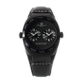 The Montres de Luxe Quartz is a unisex, minimalist timepiece in deep black, featuring a lightweight 40mm aluminum case, premium black leather strap with classic buckle, and a black analog dial protected by mineral glass; powered by a precise quartz movement and equipped with a Dual Time function for tracking two zones, it pairs refined style with everyday practicality. Note: this watch has no water resistance and is intended for indoor/dry environments only.