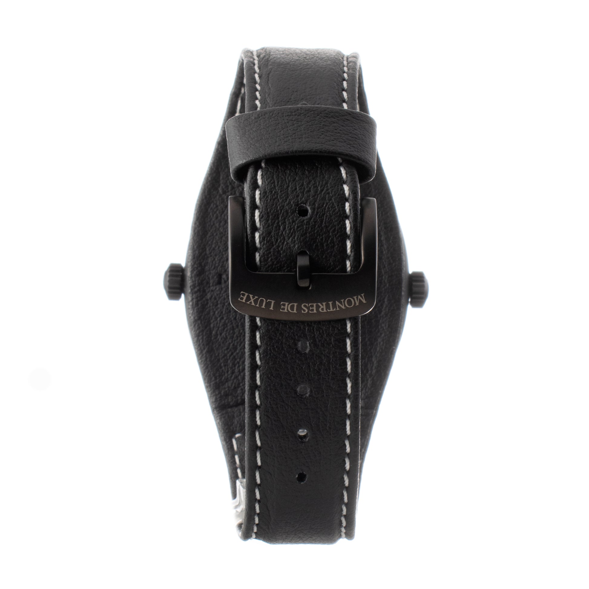 Introducing the MONTRES DE LUXE Blackout Series — a unisex, minimalist 40mm matte-black aluminum watch with a jet-black dial and genuine black leather strap. Powered by a reliable quartz movement and protected by mineral glass, it features a practical dual-time display for travelers, a classic buckle for comfort, and refined monochrome styling; please note it is not water-resistant. Ideal for formal, business, and evening wear.