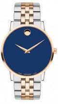 The Movado Museum Classic Men's Watch — 40mm blue dial with the signature Museum dot — pairs minimalist, iconic design with Swiss quartz precision, a stainless‑steel case, scratch‑resistant sapphire crystal and a comfortable bracelet, making it a refined, timeless choice for both everyday wear and formal occasions.