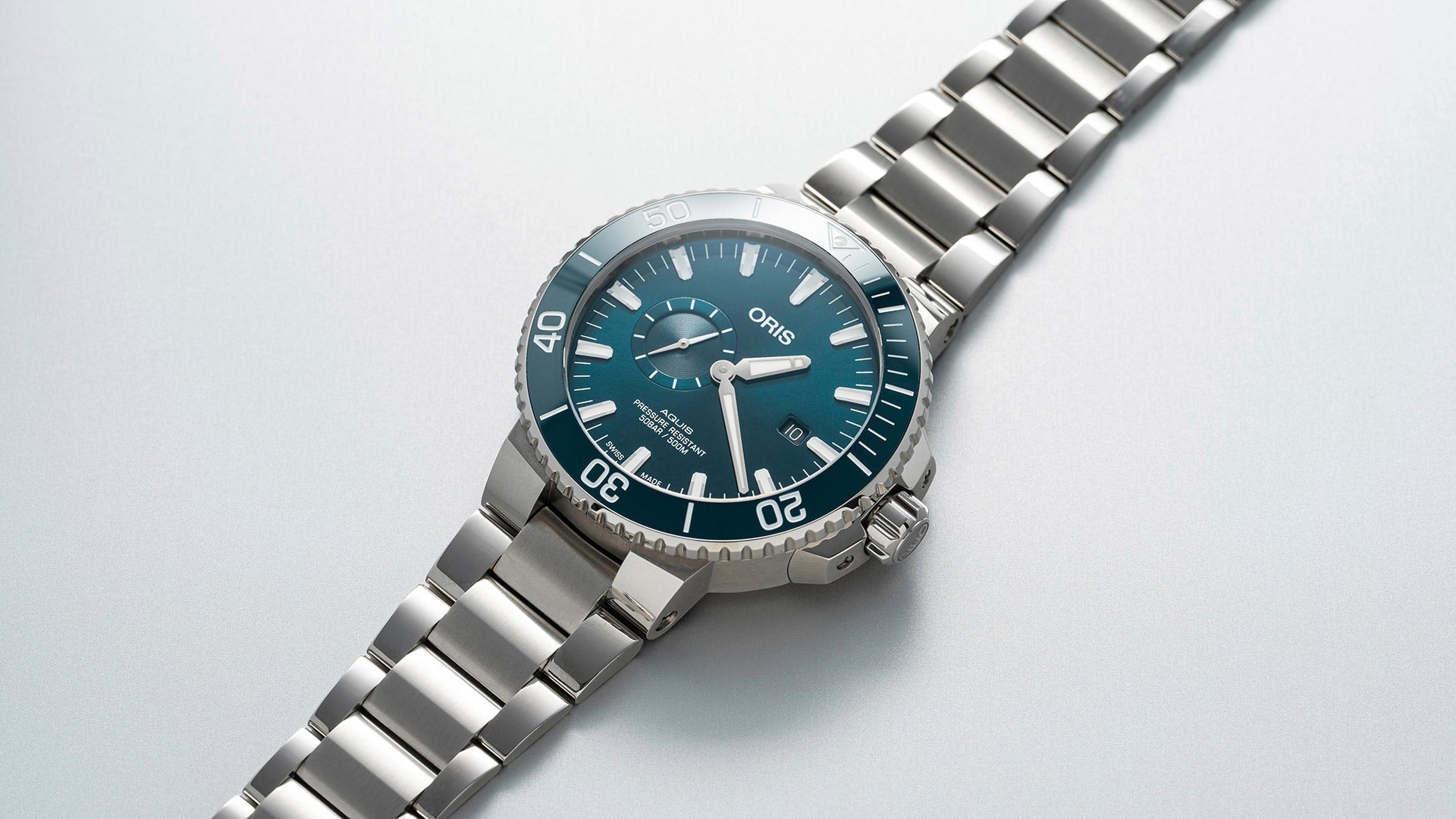 Oris Aquis Small Seconds Men's Watch 46mm — a Swiss-made, 46mm stainless steel dive watch featuring a refined small-seconds complication, reliable automatic movement, 30 bar (300 m) water resistance, scratch‑resistant sapphire crystal, luminous hands and indices, and a comfortable metal bracelet; a versatile, premium timepiece that marries technical performance with timeless elegance.