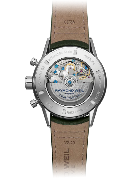 Raymond Weil Freelancer 7741‑SC7‑52021 — a 43.5 mm Swiss‑made automatic that pairs a stainless steel case and refined leather strap with sapphire crystal and an exhibition caseback; minimalist dial, silver indices and a sweeping seconds hand deliver understated luxury and precise timekeeping for office or evening wear.