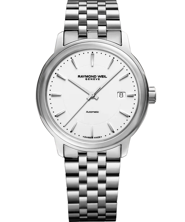 Raymond Weil Maestro 2237‑ST‑65011 — a refined 40mm Swiss‑made automatic dress watch featuring a silver dial with applied indices, elegant hands, scratch‑resistant sapphire crystal and a stainless‑steel bracelet. Combining precise mechanical movement with understated sophistication, it delivers versatile day-to-evening style for the modern gentleman.