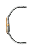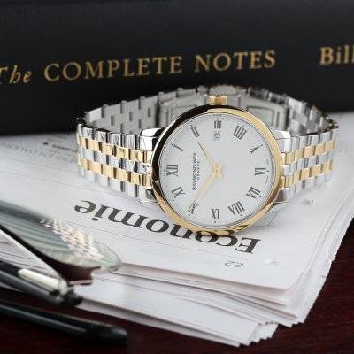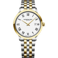 The Raymond Weil Toccata 5485-STP-00300 is a refined Swiss-made men's dress watch that pairs a two-tone stainless steel case with yellow gold PVD to a slim 39 mm × 7.89 mm profile; its white dial with black Roman numerals, scratch-resistant sapphire crystal and precise Swiss ETA quartz (F07.111) movement with date at 3 o'clock deliver understated elegance and dependable performance. Includes a 19 mm bracelet and a 2-year manufacturer’s warranty (extendable to 3 years upon registration).