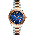 The Versace Hellenyium GMT V11060017 blends Italian luxury with Swiss precision in a 42 mm 316L stainless steel case with rose-gold PVD accents and a deep blue dial; powered by a Ronda Swiss quartz movement with GMT and date functions, protected by scratch‑resistant sapphire crystal, fitted to a two‑tone stainless steel bracelet, water‑resistant to 50 m and covered by a 2‑year warranty.
